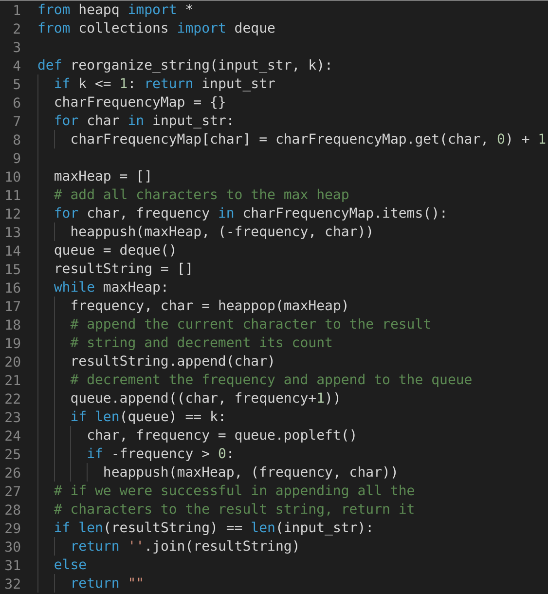 Following a similar approach, since we were inserting a character back in the heap in the next iteration, in this problem, we will re-insert the character after ‘K’ iterations. We can keep track of previous characters in a queue to insert them back in the heap after ‘K’ iterations.