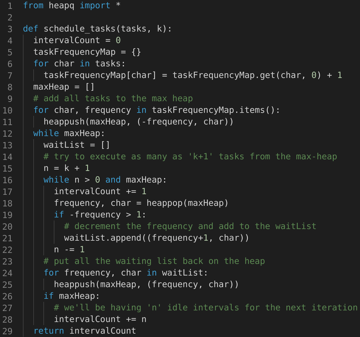 Following a similar approach, we will use a Max Heap to execute the highest frequency task first. After executing a task we decrease its frequency and put it in a waiting list. In each iteration, we will try to execute as many as k+1 tasks. For the next iteration, we will put all the waiting tasks back in the Max Heap. If, for any iteration, we are not able to execute k+1 tasks, the CPU has to remain idle for the remaining time in the next iteration.