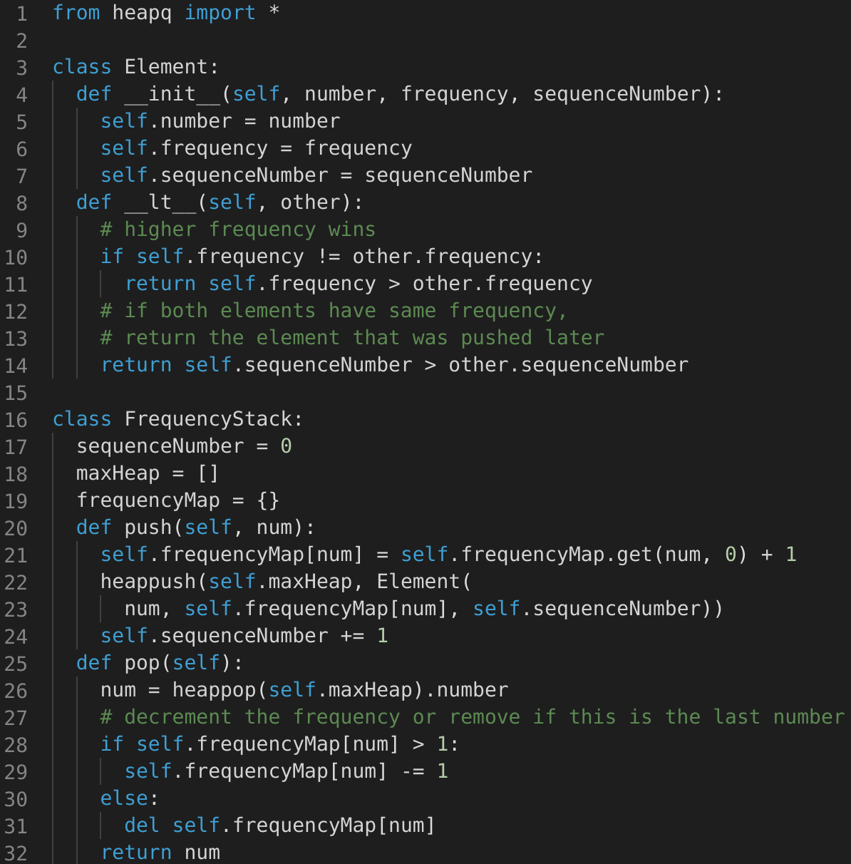 2. If two numbers have the same frequency, we will need to return the number which was pushed later while popping. To resolve this, we need to attach a sequence number to every number to know which number came first.