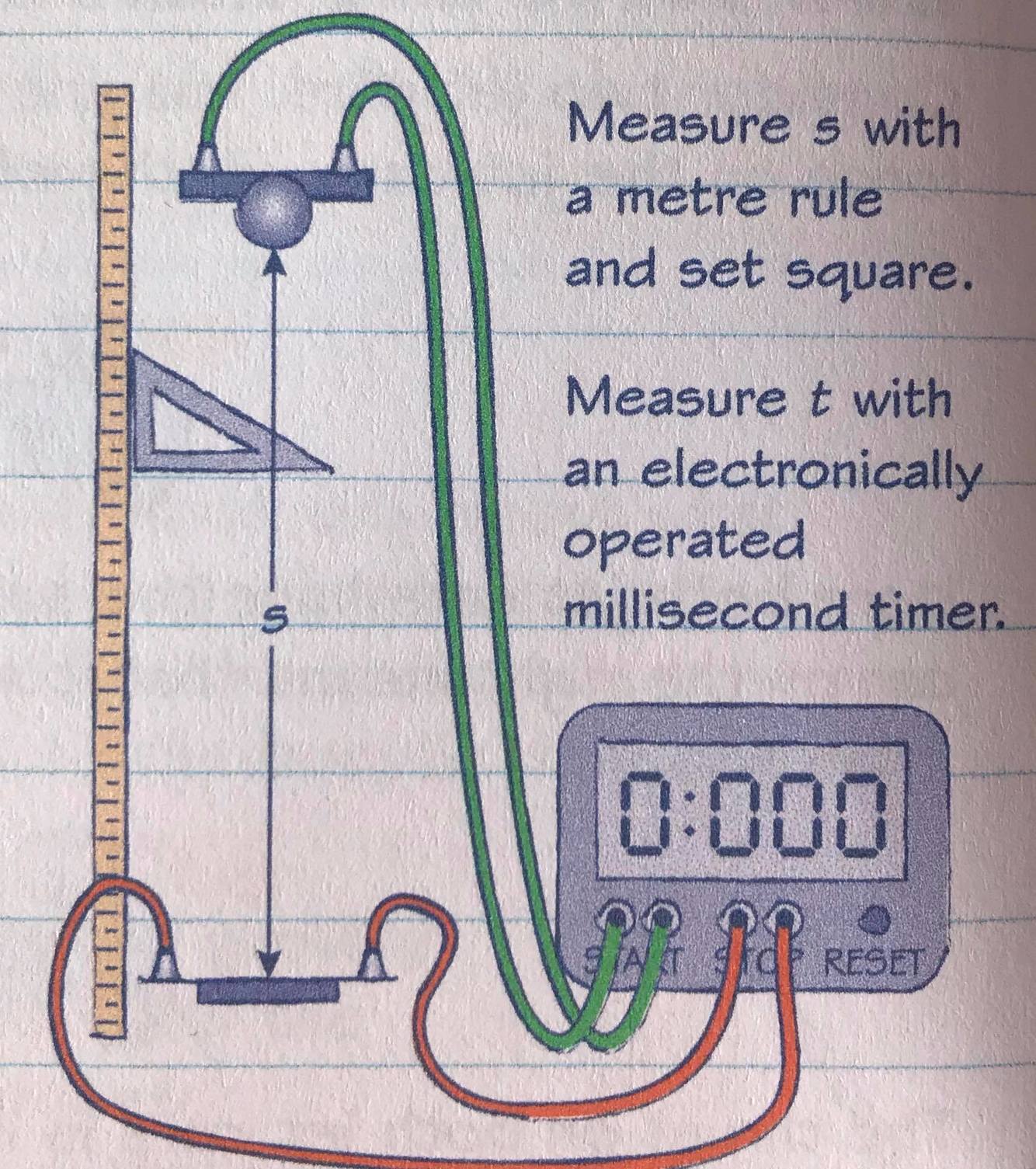 1) Drop the ball bearing through light gates (or) use an electro magnet with a switch and a trap door switch to measure the time taken for a ball bearing to fall a certain distance.
