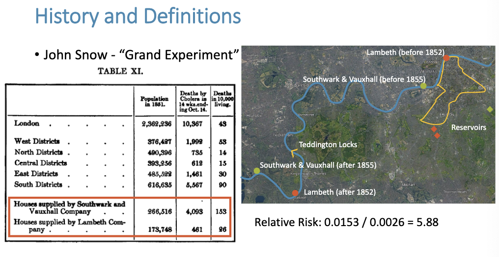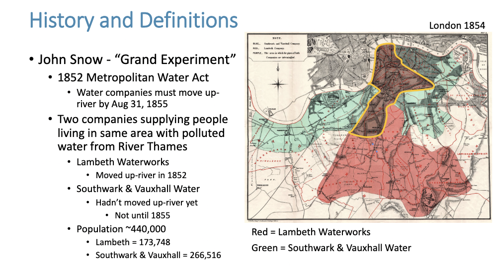 Both of them took water from river. Main difference = law that told them to move water source b/c maybe water from sewage/ocean –> gross that people drank from it. Red = moved source of water up river. Southwark did not move water source. 440,000 people monitored.