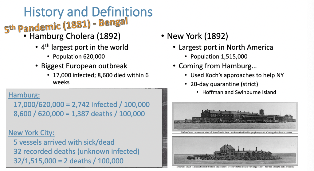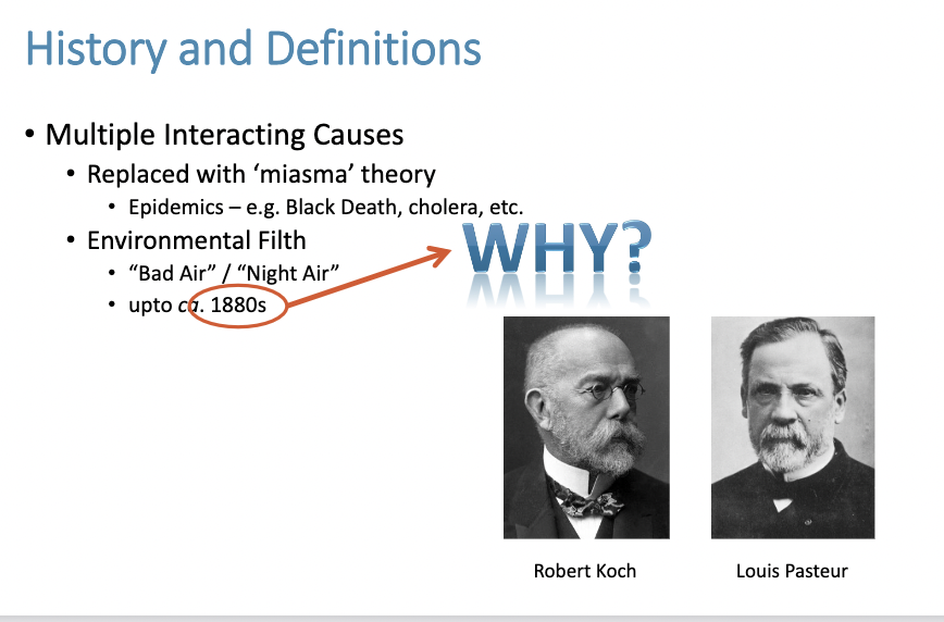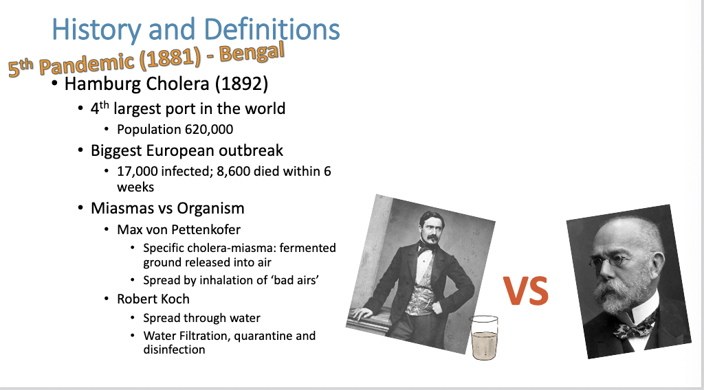 Miasmas versus new scientific way of thinking. When the 5th pandemic of cholera started in 1881, hit europe in 1892. Max = all about miasmas and bad airs. Dont’ need to do anything b/c rich people are clean and poor people are not. Peter Koch = science.