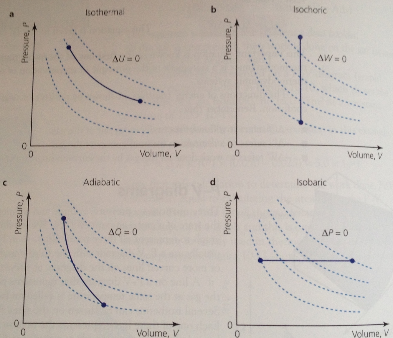 Draw the isochoric, isobaric, isothermal, and adiabatic changes of state of an ideal gas on P-V diagrams