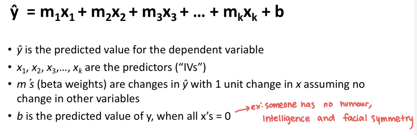 Predicting values on an outcome variable from values on more than one predictor variable. Ex: A more accurate prediction of perceived attractiveness might be made if we considered facial symmetry and intelligence.