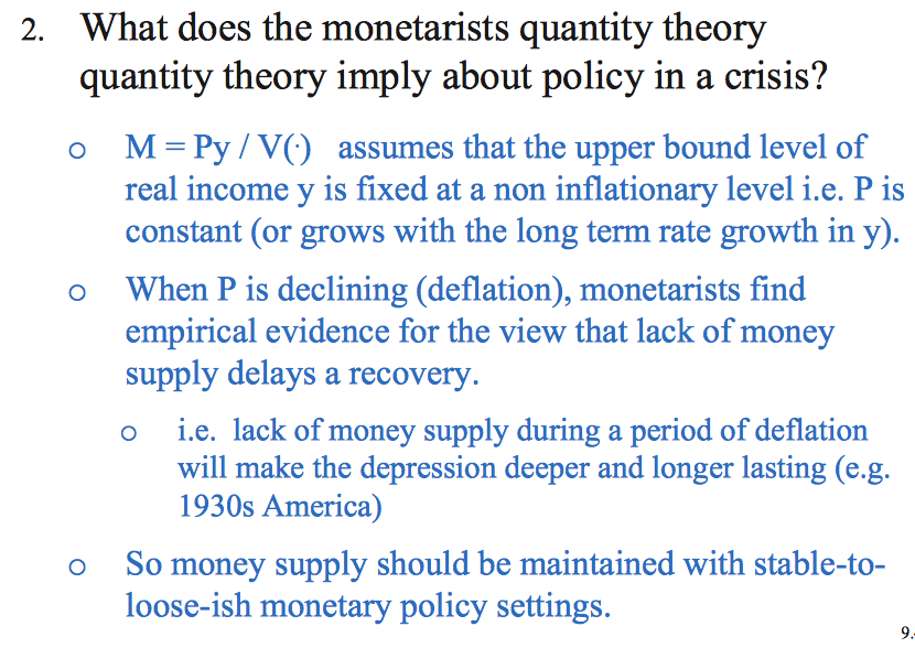 What does the classical quantity theory imply about policy in an economic and financial crisis [i.e. recession and poor financial indicators]?