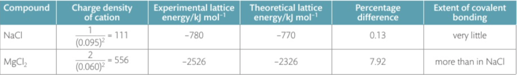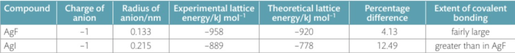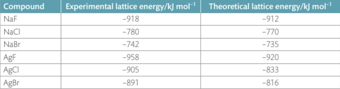 –> The bonding in the lattice has a considerable covalent character, which makes the experimental value for the lattice energy more negative than the theoretical value.