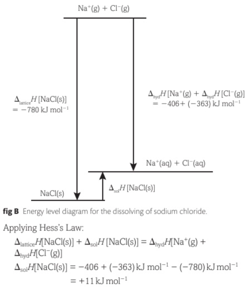 -Eg. The enthalpy change of solution for sodium chloride is the energy change associated with the following process: NaCl(s) –> Na+(aq) + Cl-(aq).