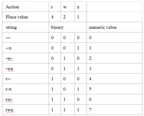 describe the binary represenation of the linux permissions