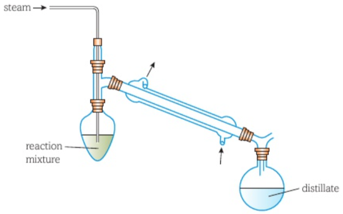 -It involves passing steam into a mixture that contains an aqueous solution and a liquid that forms a separate layer.