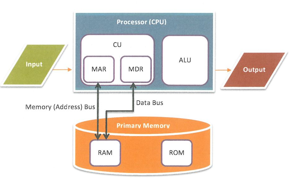 arithmetic logic unit (ALU), control unit (CU), memory address register (MAR), memory data register (MDR)