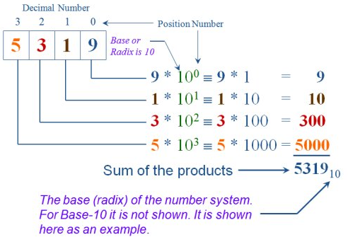 The standard base 10 number system using ten digits (0, 1, 2, …, 9). Each digit represents a multiple of a power of ten (e.g. 354 = 3100 + 510 + 4*1)