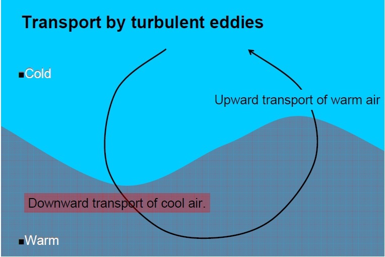 vertical transport of heat by turbulant eddies. Laminar layer at surface is heated and distributed vertically.