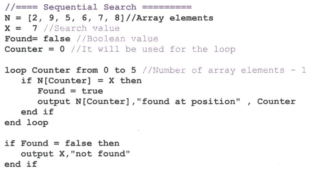 Construct pseudocode for the linear search/sequential search algorithm.