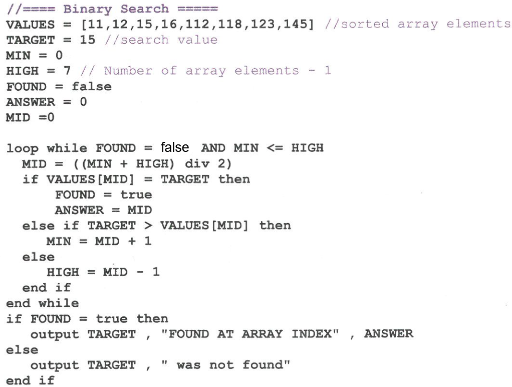 Construct pseudocode for the binary search algorithm.
