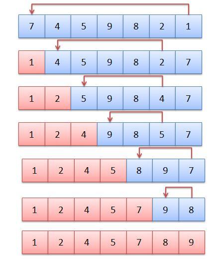 A simple and inefficient sorting algorithm, divides the array into a sorted subarray and an unsorted subarray. It finds the smallest element in the unsorted subarray and swaps it with the first element in the unsorted subarray, putting it in sorted order. Now the sorted subarray is one element larger and the unsorted one element smaller. This is repeated until the sorted subarray is the entire array.