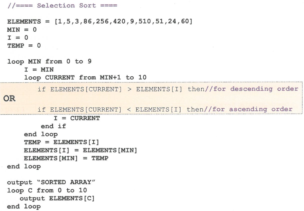 Construct pseudocode for the selection sort algorithm.