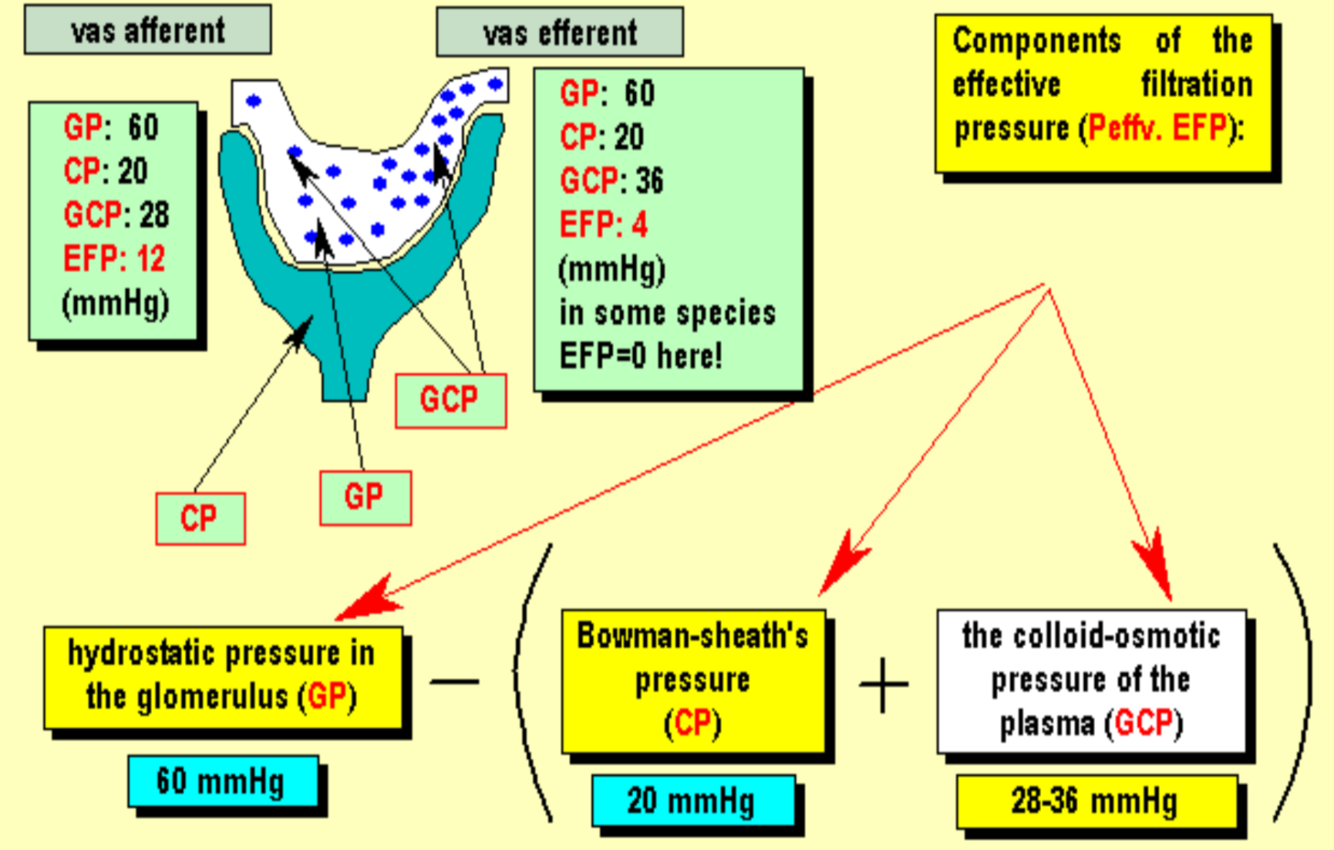 Give the valuse for the vas afferent and vas efferent occuring in effective filtration pressure