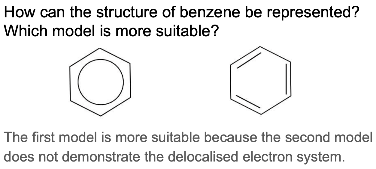 Benzene’s delocalised ring of electrons is a region of high electron density which attracts electrophiles. However, the ring of electrons is very stable so benzene does not undergo electrophilic addition as this would break up the delocalised ring of electrons.