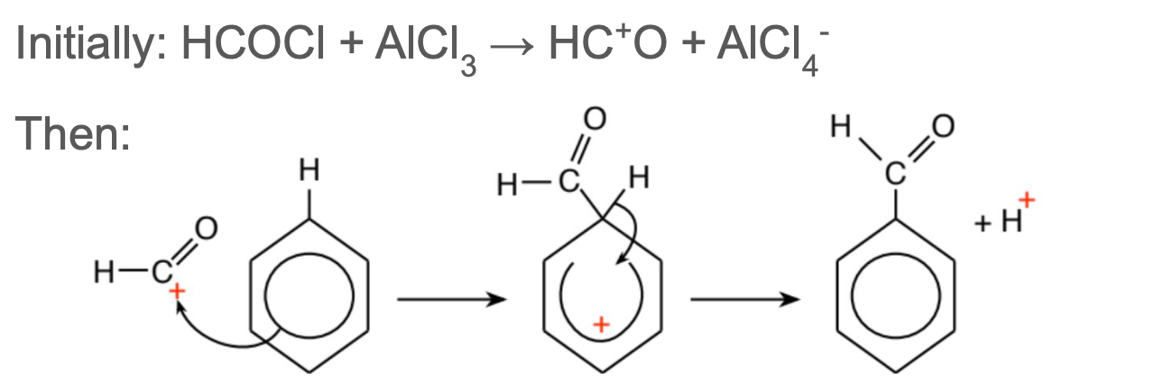Draw the electrophilic substitution mechanism for the reaction between benzene and methanoyl chloride
