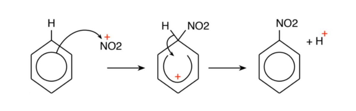 Draw the electrophilic substitution mechanism for the nitration of benzene