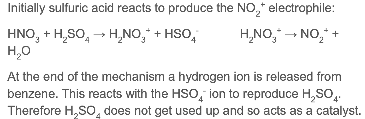 How does sulfuric acid act as a catalyst in the nitration of benzene?