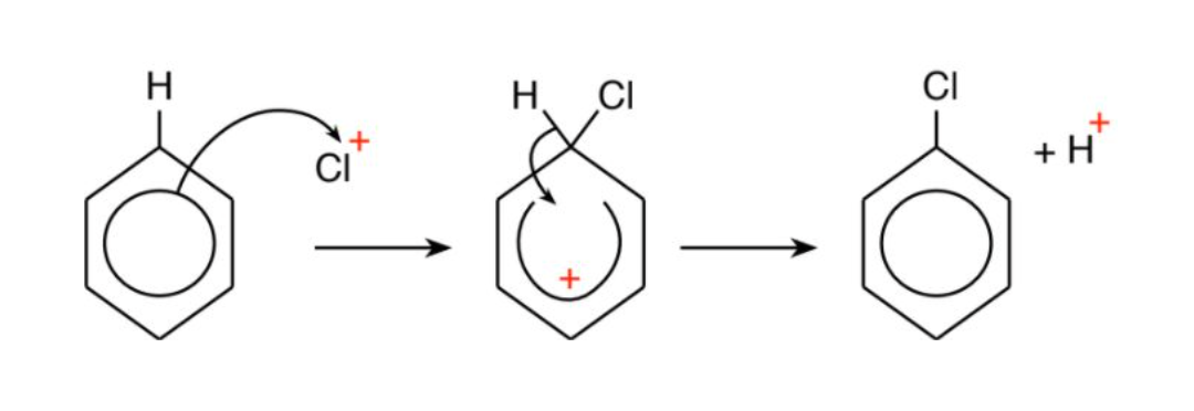 Draw the electrophilic substitution mechanism for the reaction between benzene and chlorine