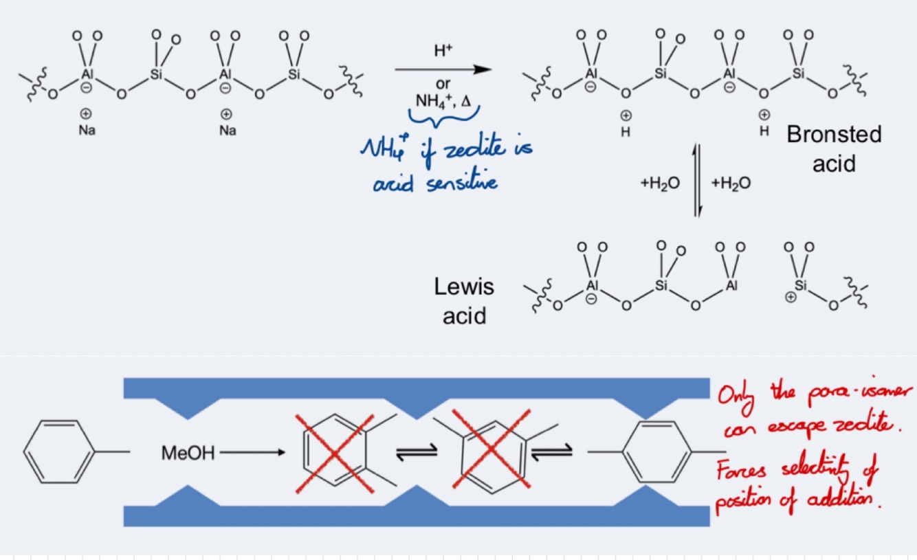 Zeolites can act as Bronsted acid catalysts (H+ counter ion forms hydroxylated bridge)