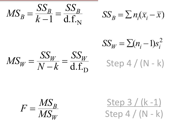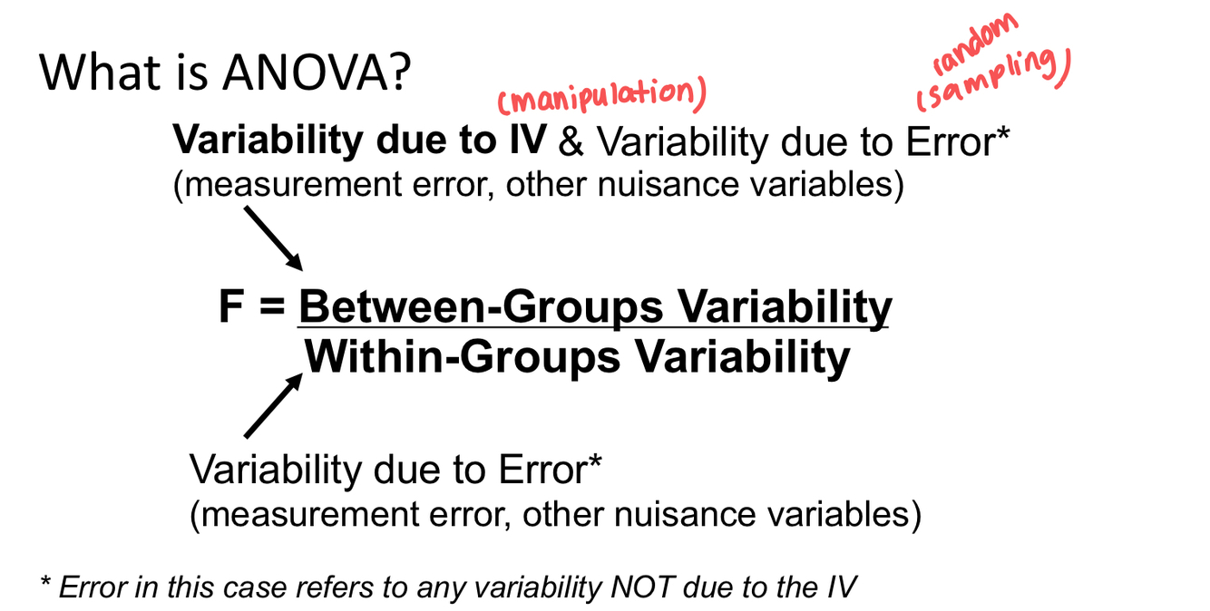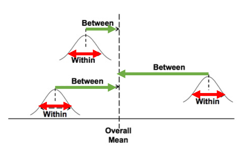 - How much the sample means differ (on average) from the overall mean (of all scores) to how much individual score differ from their own sample means (on average)
