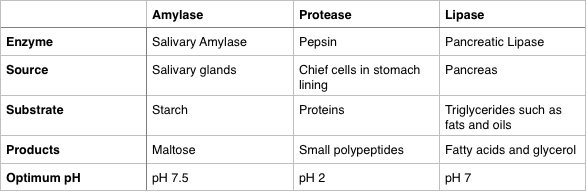 6.1.3 State the source, substrate, products and optimum pH conditions for one amylase, one protease and one lipase.