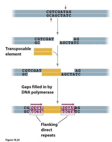 During the transposition process, the transposase enzyme recognizes and binds to the direct repeats, and uses them as a recognition site to excise the transposable element from its original location in the genome. The transposase then inserts the transposable element into a new location in the genome, often creating a short duplication of the direct repeats at the target site.