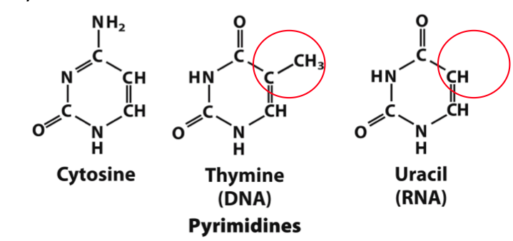 Pyrimidines (cytosine, thymine & uracil) =>sml, monocyclic