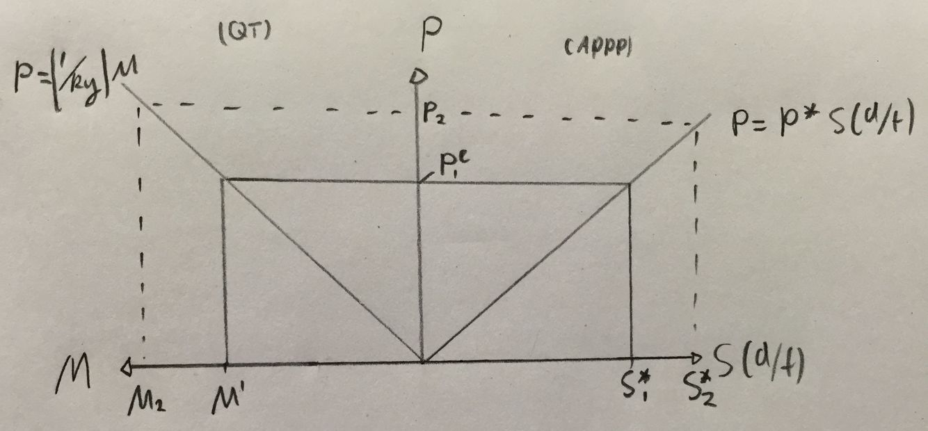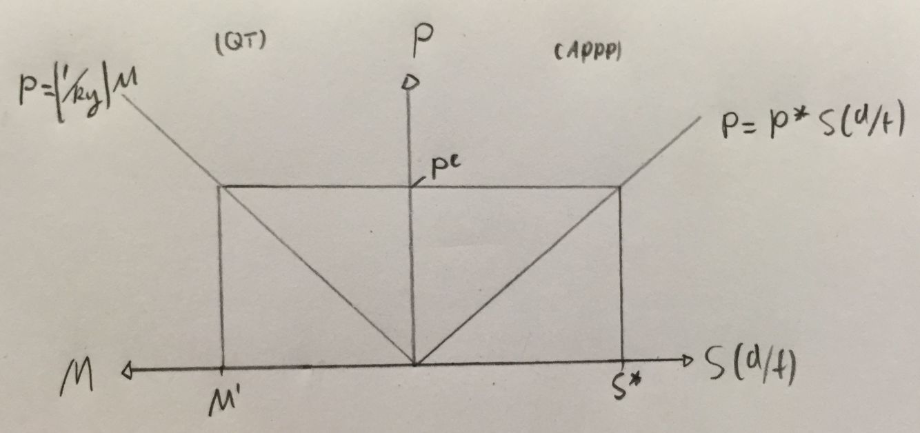 By combining absolute purchasing power parity and quantity theory.