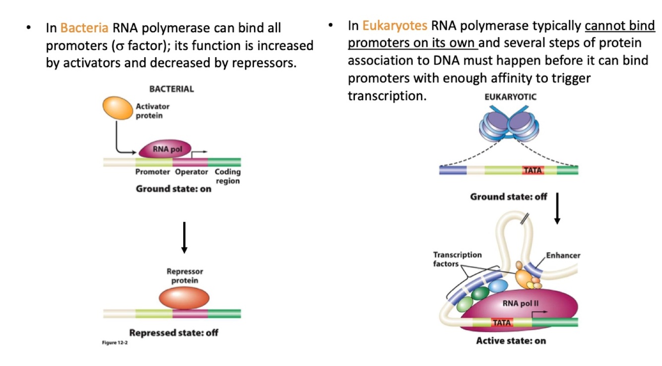 Compare transcriptional regulation in bacteria and eukaryotes.
