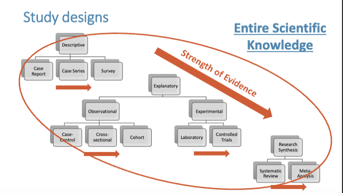 List the study designs in order from least to greatest strength of evidence?