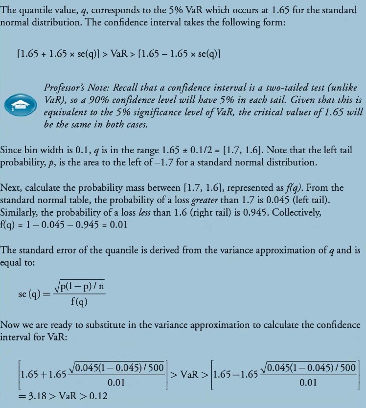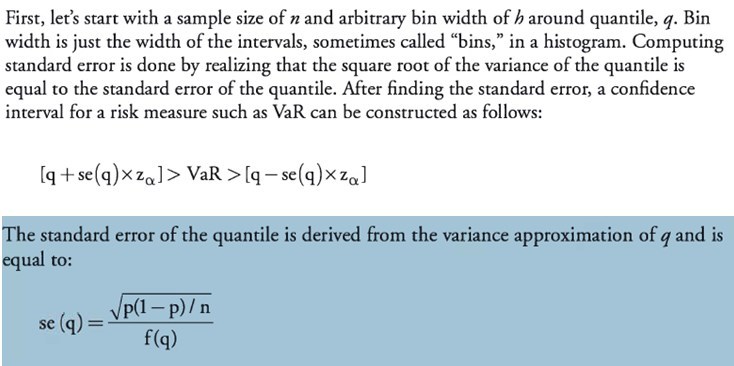 A major limitation of the VaR measure is that it does not tell the investor the amount or magnitude of the actual loss. VaR only provides the maximum value we can lose for a given confidence level. The expected shortfall (ES) provides an estimate of the tail loss by averaging the VaRs for increasing confidence levels in the tail. Specifically, the tail mass is divided into n equal slices and the corresponding n — 1 VaRs are computed.
