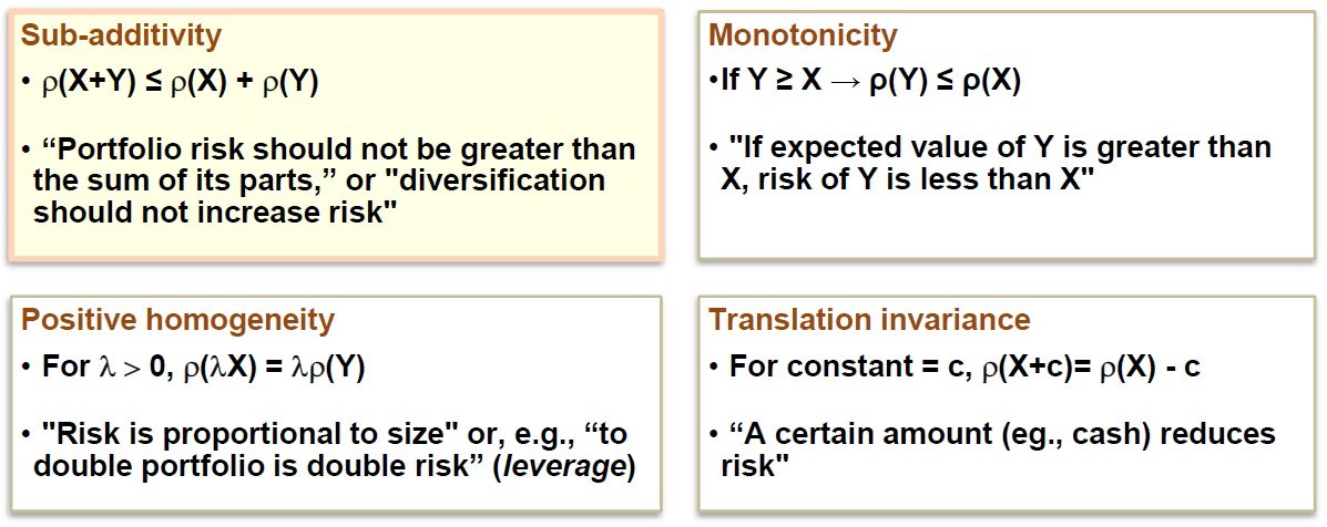 Where X and Y represent future values and rho, ρ(.), is the risk measure, a coherent risk measure must meet all four (4) of the following conditions: