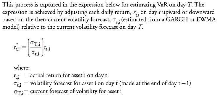 Filtered historical simulation is a form of semi-parametric bootstrap which aims to combine the benefits of HS with the power and flexibility of conditional volatility models such as GARCH.