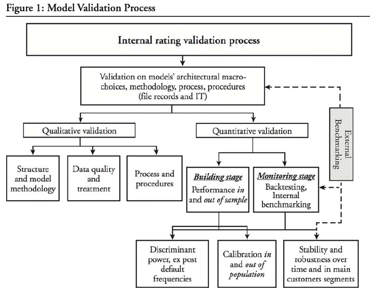 Additionally, the validation process must deal with the continuity of validation processes, which includes periodic analysis of model performance and stability, analysis of model relationships, and comparisons of model outputs versus actual outcomes. In addition, the validation of statistical models must evaluate the completeness of documentation with focus on documenting the statistical foundations. Finally, validation must consider external benchmarks such as how rating systems are used by competitors.