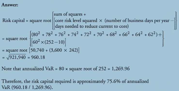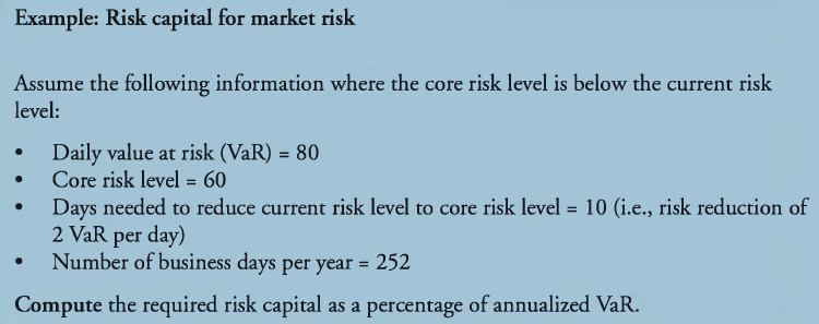 Fully diversified capital takes into consideration the diversification benefits, which equal $20 ($50 + $60 — $90). For simplicity, the diversification benefit can be done on a pro-rata basis as follows: ($20 x $50) / $110 = $9.1 is allocated to Activity A and ($20 x $60) /$ 110 = $10.9 is allocated to Activity B. Therefore, Activities A and B have fully diversified capital of $40.9 and $48.1, respectively. Fully diversified capital should be used to determine a firm’s solvency and to determine the minimum amount of risk capital required for a given activity.