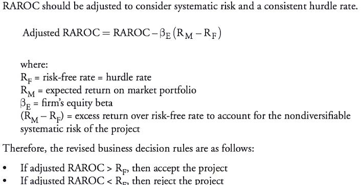 Obviously, a shortcoming of the above rules is that higher return projects that have a RAROC > hurdle rate (accepted projects) also come with high risk that could ultimately result in losses and reduce the value of the firm. In addition, lower return projects that have a RAROC < hurdle rate (rejected projects) also come with low risk that could provide steady returns and increase the value of the firm. As a result, an adjusted RAROC measure should be computed.
