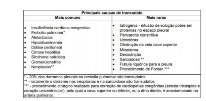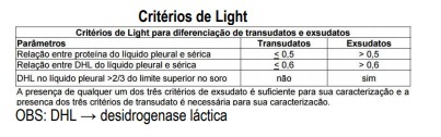 OBS: A PRESENÇA DE QUALQUER UM DOS TRÊS CRITÉRIOS DE EXSUDATO É SUFICIENTE PARA SUA CARACTERIZAÇÃO E A PRESENÇA DOS TRÊS CRITÉRIOS DE TRANSUDATO É NECESSÁRIA PARA SUA CARACTERIZAÇÃO.