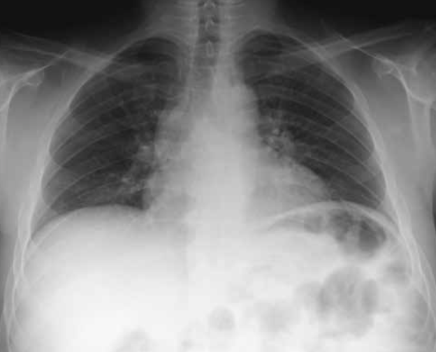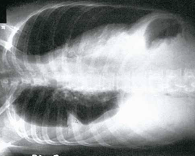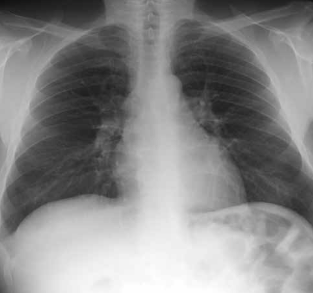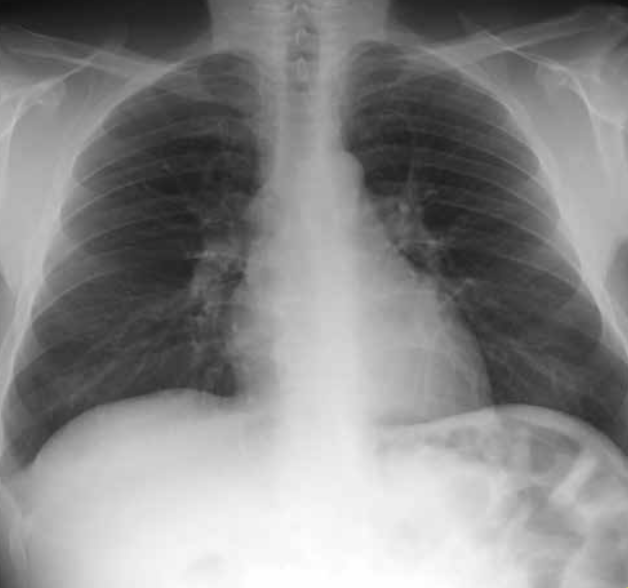 Neumonía del lóbulo inferior izquierdo. La consolidación del lóbulo inferior izquierdo borra el contorno del hemidiafragma izquierdo (infiltrado retrocardiaco).