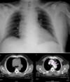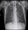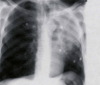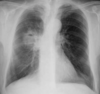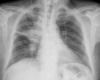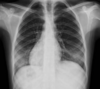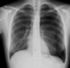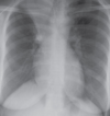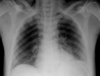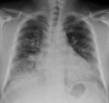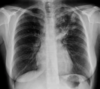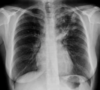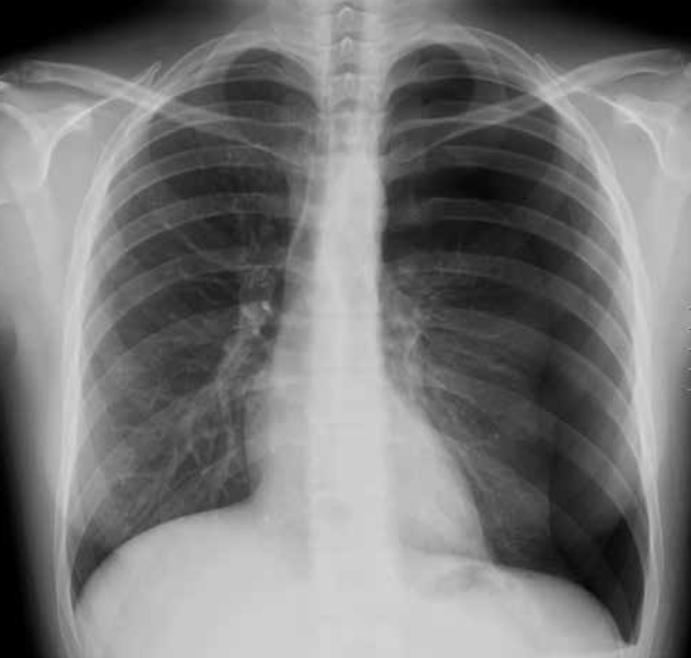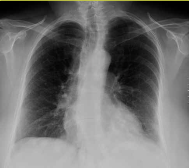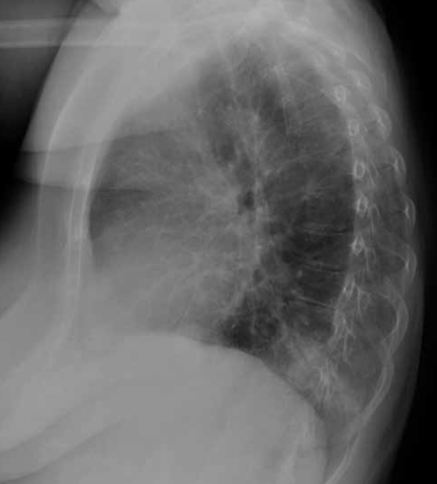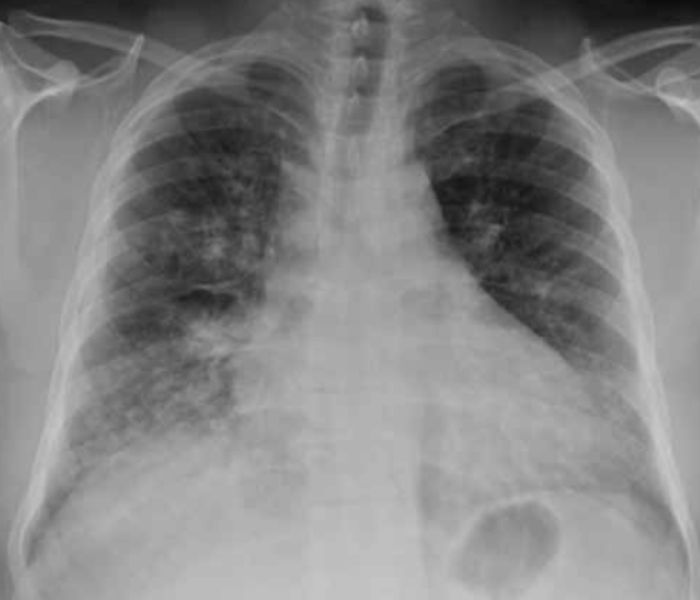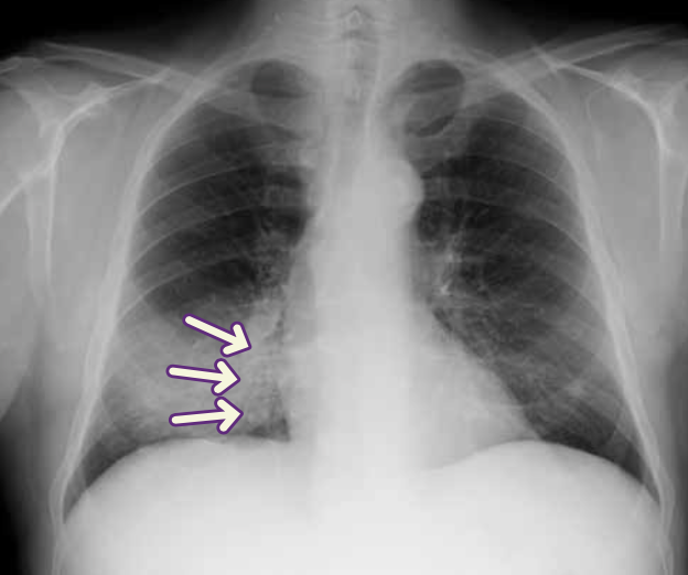 Consolidación del lóbulo medio en la que se aprecia el signo del broncograma aéreo. La visualización de aire en los bronquios intrapulmonares en una radiografía de tórax se llama signo del broncograma aéreo.