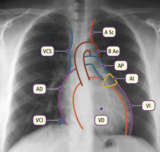 En el lado izquierdo la parte superior representa la silueta de la arteria subclavia (A Sc) que se continúa con la prominencia del botón aórtico (B Ao).