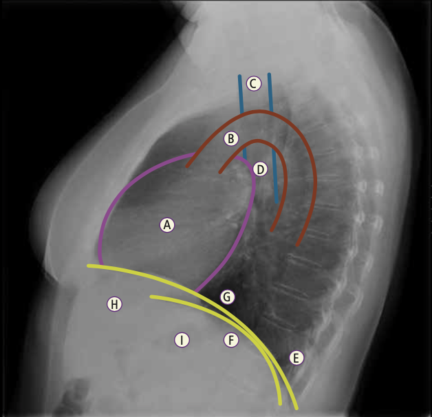 A: Corazón. B: Cayado aórtico. C: Tráquea. D: Hilio. E: Ángulo costofrénico. F: Diafragma izquierdo. G: Diafragma derecho. H: Hígado. I: Burbuja gástrica.