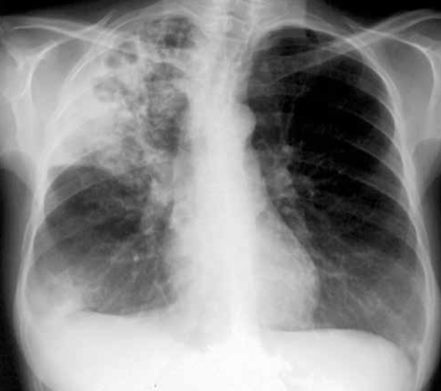 Consolidación con pérdida de volumen y lesiones cavitadas en lóbulo superior derecho. Además, se observa consolidación periférica basal derecha.