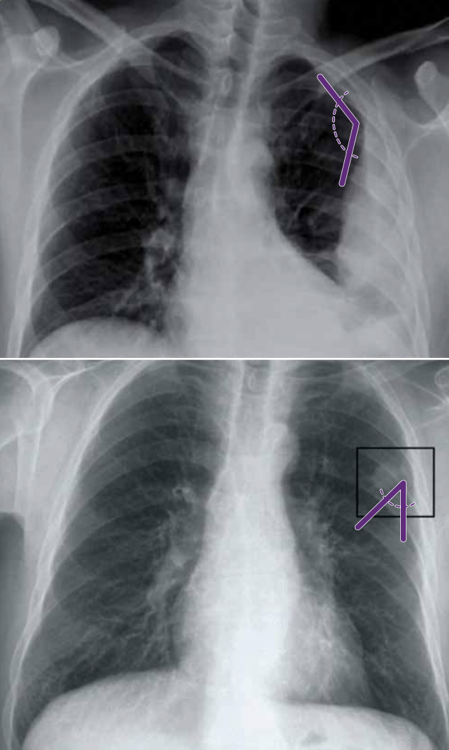 Nos fijaremos en el ángulo que forma la lesión con la pared torácica: