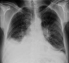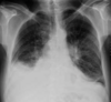 Neumonía del lóbulo inferior izquierdo. La consolidación del lóbulo inferior izquierdo borra el contorno de la aorta descendente (infiltrado retrocardiaco).