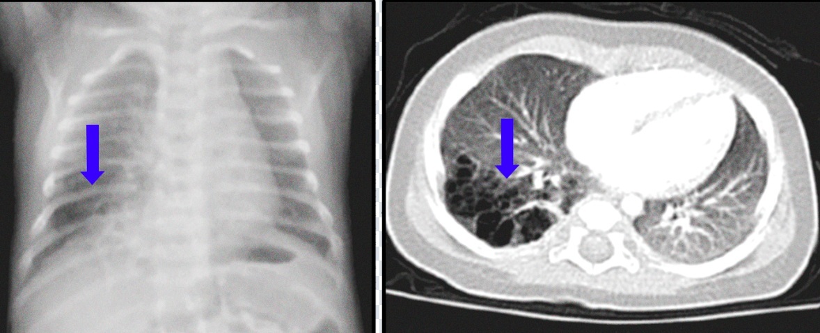 MAC3: mais graves com cistos grandes que podem afetar todo o lobo pulmonar afetado