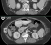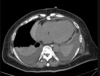 TC: Cisto com densidade de líquido, margens bem definidas que podem realçar com contraste; podem complicar com hemorragia, infecção: nível liquido, espessamento parietal.